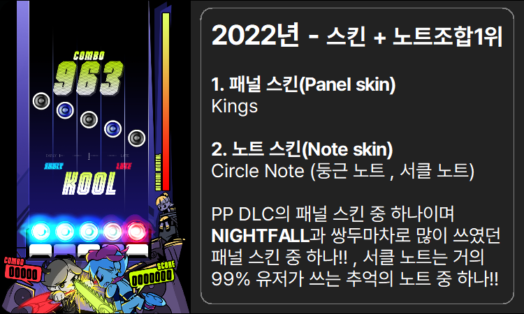 먼저 2022년입니다. - (뇌피셜 기준) 유저들이 가장 많이 사용했던 패널(스킨) + 노트 조합 1위는??